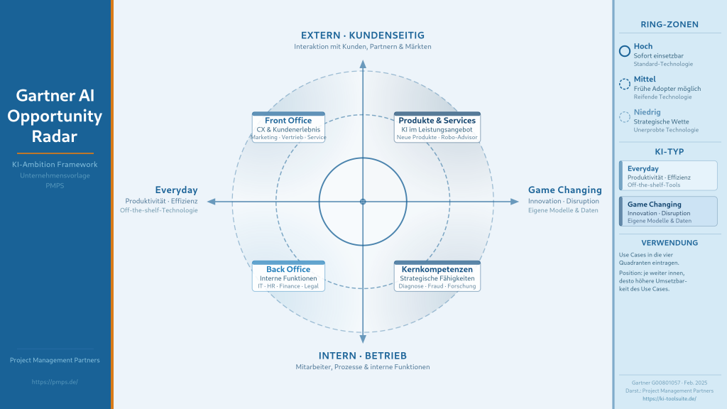 Das Gartner “AI Opportunity Radar” liefert ein praxisnahes Rahmenwerk, das es Unternehmen ermöglicht, ihre KI-Initiativen systematisch zu bewerten und gezielt umzusetzen. Es bieten sich hier klare Anknüpfungspunkte: Von der Definition der eigenen KI-Ambition über den gezielten Einsatz im Front und Back Office bis hin zur Entwicklung innovativer Produkte und Dienstleistungen.